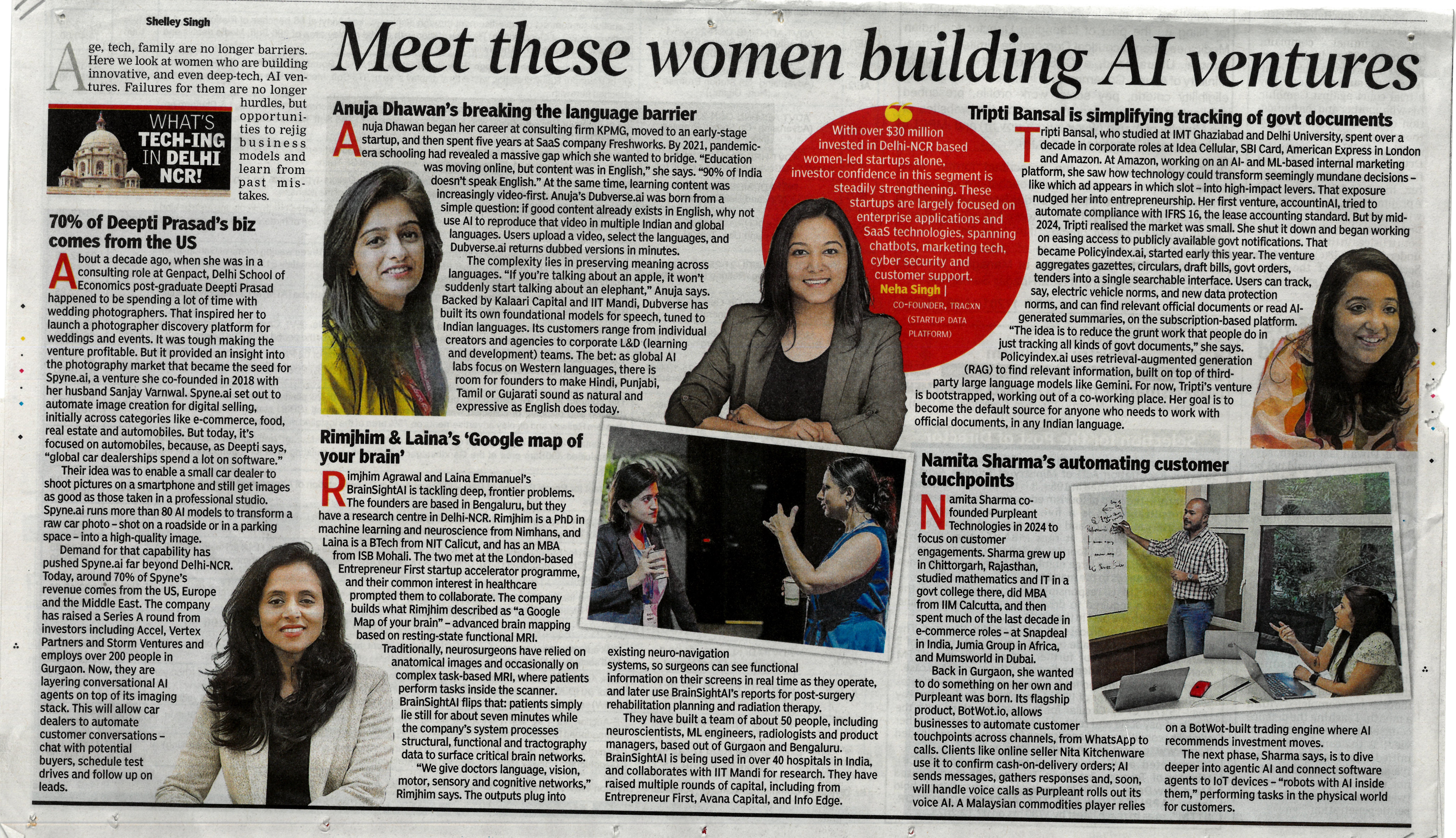This article highlights five women entrepreneurs who are leading innovative AI-driven ventures across India. It showcases their journeys, the problems they aim to solve, and the technological solutions they have developed. The stories feature Deepti Prasad, whose platform Spynal transforms amateur images into professional outputs; Anuja Dhawan, who builds AI-based multilingual learning tools; Rimjhim Agrawal and Laina Emmanuel, whose company BrainSightAI develops neuro-navigation and mental-health diagnostics; Tripti Bansal, who simplifies tracking and compliance of government documents through PolicyGenieAI; and Namita Sharma, who automates customer engagement across multiple channels. Together, these founders reflect the growing momentum of women-led AI enterprises in India, contributing to sectors such as education, health-tech, mobility, e-commerce, compliance, and customer experience.