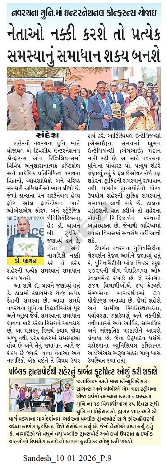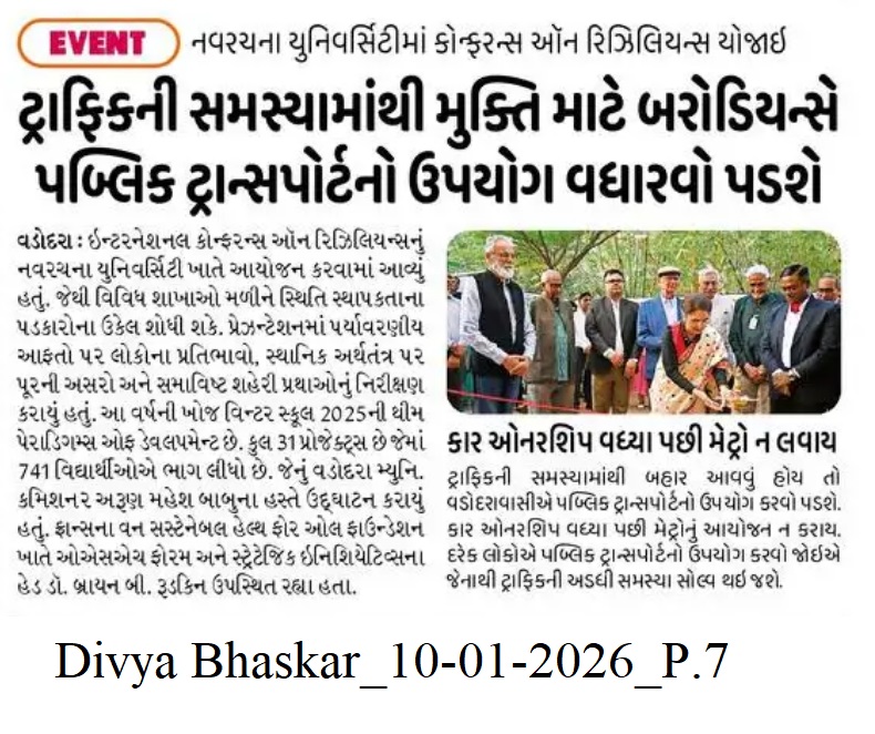 The two-day International Conference on Resilience, held at the city's Navrachana University, brought together scholars, practitioners and senior government officials from diverse disciplinary perspectives and regional representation. In addition to the OSH Forum at the One Sustainable Health for All Foundation in France and the Strategic Initiatives Head Dr. Brian B Rudkin said that every problem in every city can be solved if leaders and citizens decide. Along with this, Dr. Brian said that currently climate change is a problem of every country. At such a time, I welcome the research done by the students of Navrachana University to solve problems like floods and earthquakes. This kind of research has not been seen anywhere. Every city has problems and their solution is possible only when the leaders and citizens of that city come together to discuss that issue and work on it. In the era of Artificial Intelligence (AI), Human Intelligence (HI) is gaining ground. Along with this, Navrachana University Provost Prof. Pratyush Shankar said that flyovers are not the solution to the traffic problem of any city. Proper use of public transport can solve the traffic problem of the city. Talking about the current Vadodara, it may be necessary to redesign the city's roads. In addition, Navrachana University Chairperson Tejal Amin said that the theme of the university's Khoj Winter School 2025 has been kept as Paradigms of Development. Under which 741 students have created projects under the guidance of 65 faculty members. Which have covered urban and rural resilience, environment, sustainability and technological innovations and economic, social and cultural challenges. Vadodara Municipal Commissioner IAS Arun Mahesh Babu was especially present at the inauguration.