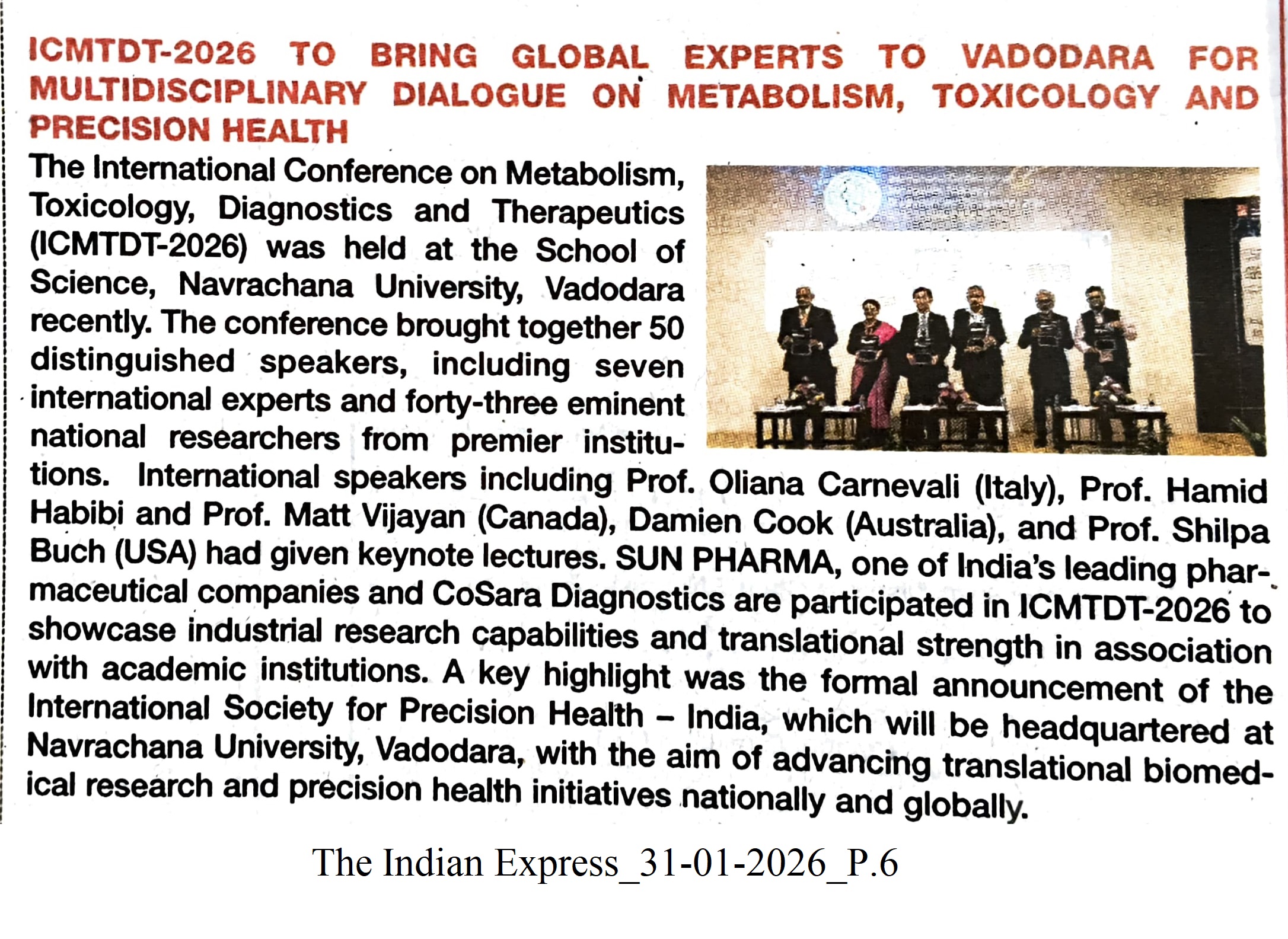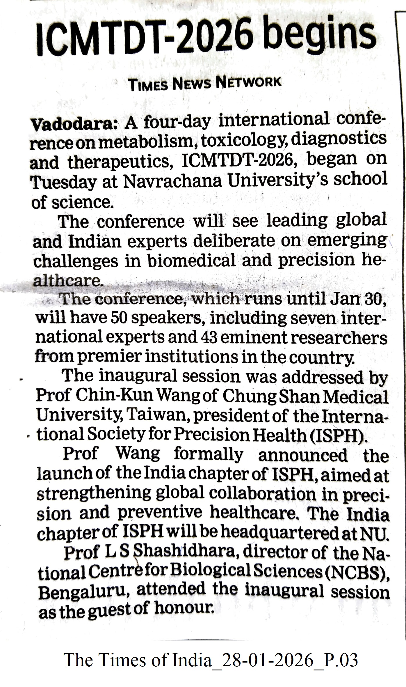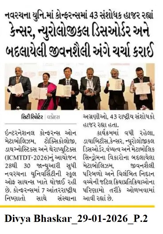 A four-day international conference on metabolism, toxicology, diagnostics, and therapeutics, ICMTDT-2026, commenced at Navrachana University on Tuesday, featuring 50 speakers, including seven international experts. The conference focuses on challenges in biomedical and precision healthcare, with Prof. Chin-Kun Wang from Chung Shan Medical University announcing the launch of the India chapter of the International Society for Precision Health. This chapter, headquartered at NU, aims to enhance global collaboration in precision and preventive healthcare. Prof. LS Shashidhara from the National Centre for Biological Sciences was the guest of honour at the inaugural session.